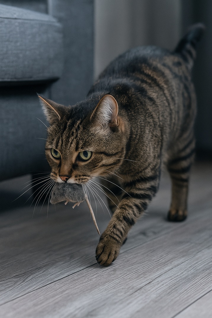 Koty często przynoszą upolowane zwierzęta do domu jako formę „podarunku” dla właściciela. Kot traktuje Ciebie jak członka swojego stada i chce dzielić się zdobyczą, pokazując troskę lub przywiązanie.